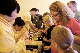 叠莲花展台位于儿童专设区,但从一开始,象征修炼人高尚品格的美丽莲花,不仅引起孩子们的极大兴趣,也同样受到他(她)们的父母、祖父母的喜爱,常常一家老小,祖孙几辈,个个上阵,人人动手,直到人手一朵莲花,才心满意足的离开。很多过路人看着儿童专用区内有这么多成年人,感到好奇,也挤进来探个究竟,但当他(她)们看到莲花时,都不由自主发出一声惊叹:“太漂亮了,我可以做一朵吗?”