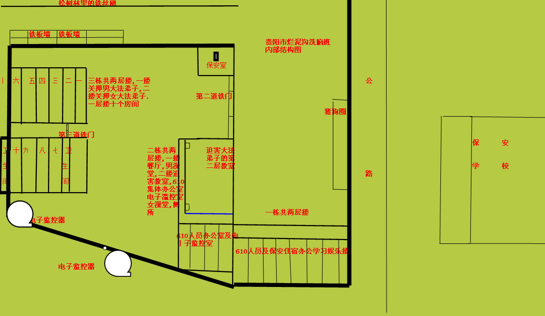 该洗脑班藏在武汉警官学校的校园里,红框里既是洗脑班所在地,楼房是三层楼房,楼前是一个篮球场,四周是围墙,院墙大门要从警察学校进入,平时都有该校学生带警棍把门。