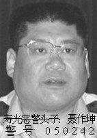 8、聂作坤,原安丘恶警头子,零七年一月任寿光恶警头子,七次被追查,其中五次因迫害安丘大法弟子被追查。零八年三次,二次因张月兰、马志信被迫害致死涉案责任人被追查。0536-5298001, 5209266 宅0536-4261398,手机13963630388