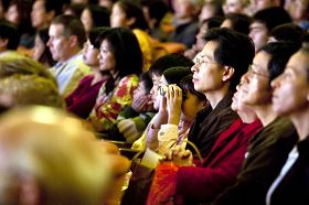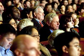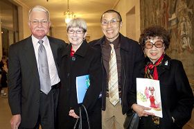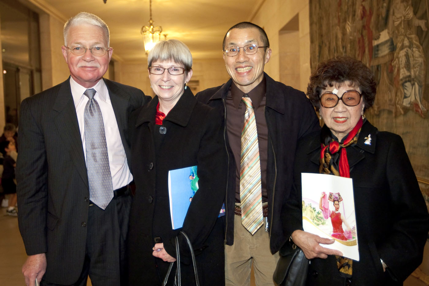 ![]() 右起:中国舞蹈文化中心的创办者、退休舞蹈家白丽心与儿子Alvin Low、和她的朋友先生及软体公司股票投资人Helen Bowling与退休数据中心经理John Bowling一起观看了神韵在旧金山的最后一场演出。 |