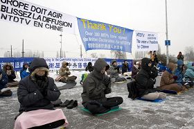 元月十四日,包括法轮功学员在内的新!唐!人:支持者冒雪在欧洲议会前呼吁,同时打出“感谢声援新!唐!人:的欧洲议员”等横幅,他们一整天在风雪中的坚持感动了不少议员。