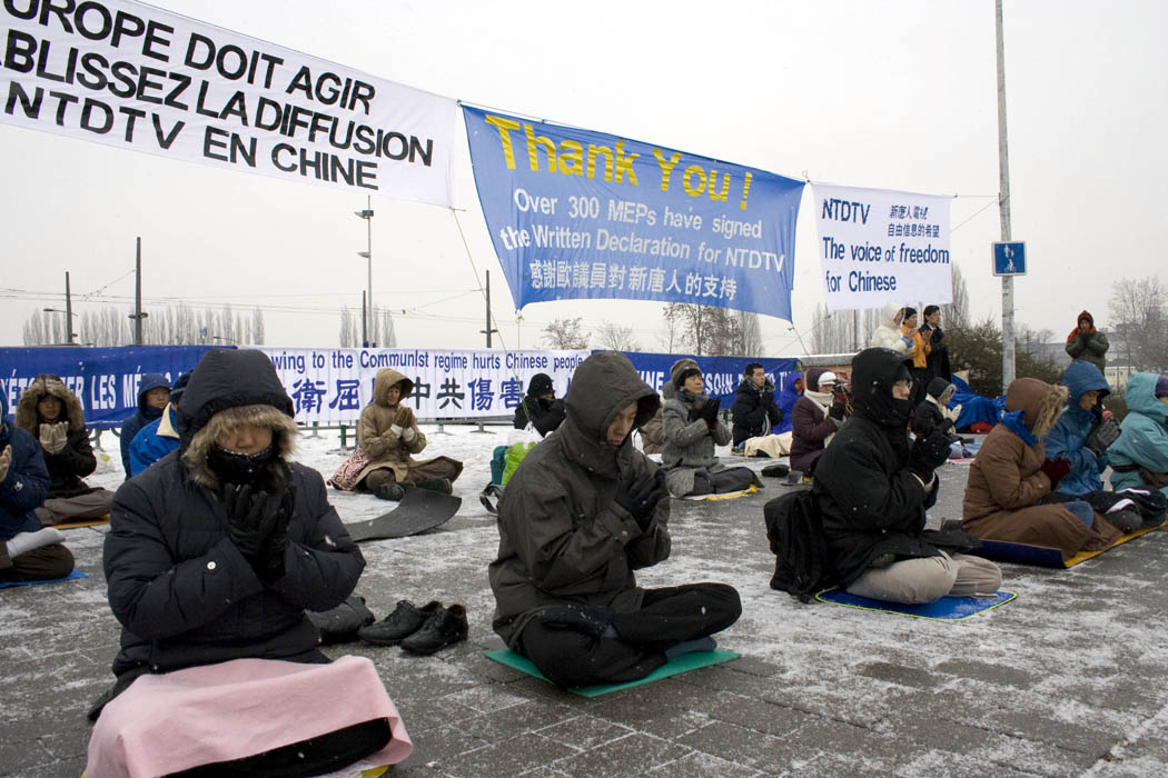 在冰天雪地中记者采访了那些呼吁恢复新!唐!人:对华播出信号的新!唐!人:支持者,负责组织的胡先生告诉记者:“欧卫切断新!唐!人:的信号的六个月中,我们不间断的在欧卫公司前和欧洲议会举行活动,使形势变化很大,一些原本不了解情况的议员也改变了他们的看法。我们要求议员能支持恢复新!唐!人:对华播出,尽早让大陆华人看到新!唐!人:电视节目。我身后坐在雪地里的人都是这样的心情,我们希望发出正义的声音,不要说是下雨,哪怕是下铁我们也要来。”