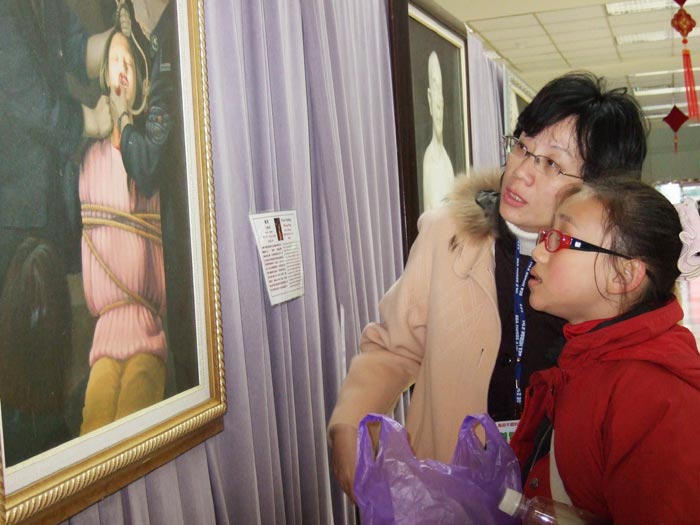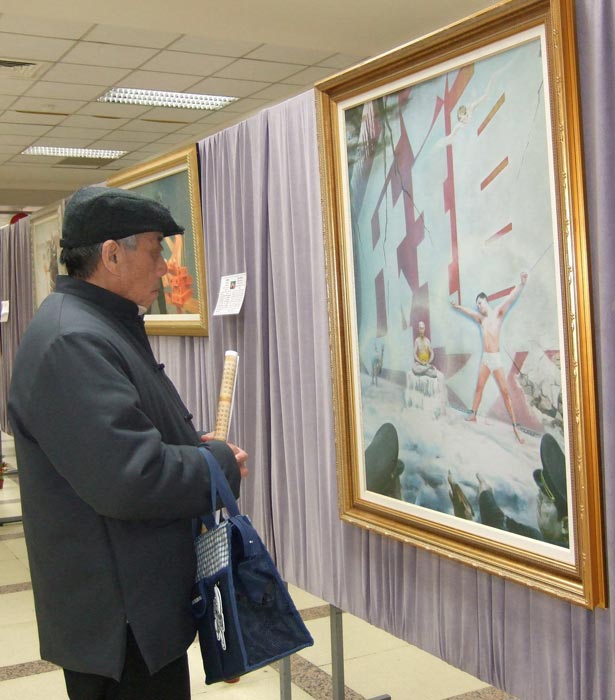 一位退休律师到县政府洽公,看到了画展,他对画作《天人合一》中打坐者的表情露出了向往,他说他曾经盘过腿但很痛,看到这幅女士打坐的油画,感觉很舒服。而当他看到修炼者被中共迫害的画作时,眼眶红了并掉下泪来。