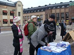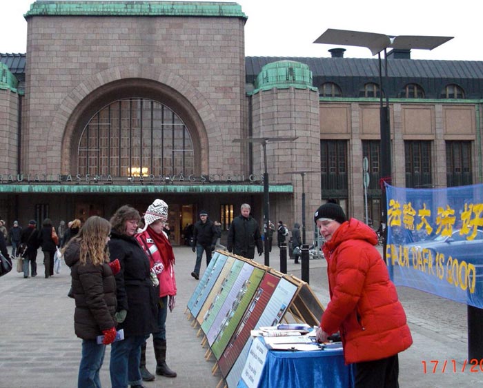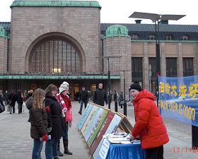 ![]() 芬兰法轮功学员在赫尔辛基中心火车站一侧的讲真相活动 |