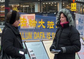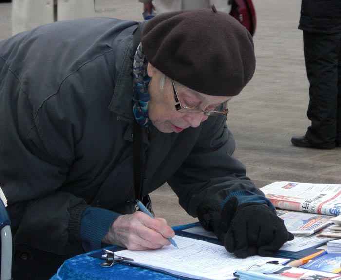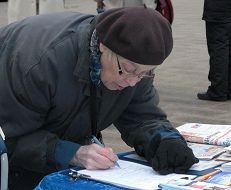 老妇人Ulla躬着几乎弯成九十度的背,困难的行走着,当看到寒冷中坚持讲真相的法轮功学员时,她以为在宣传什么呢。学员小王告诉她,是法轮功学员在向人们讲述因信仰“真、善、忍”而遭中共迫害的真相。老人一听,先是问你们要钱吗?听小王说法轮功不收钱,是呼吁大家帮助,共同制止迫害。她立即走到征签桌前,郑重地签了名。
