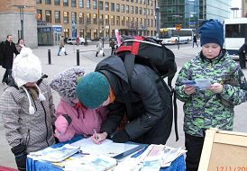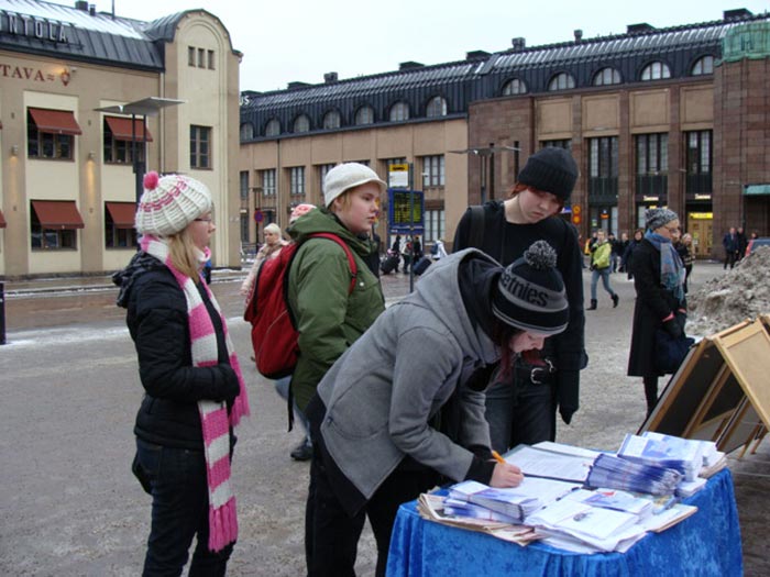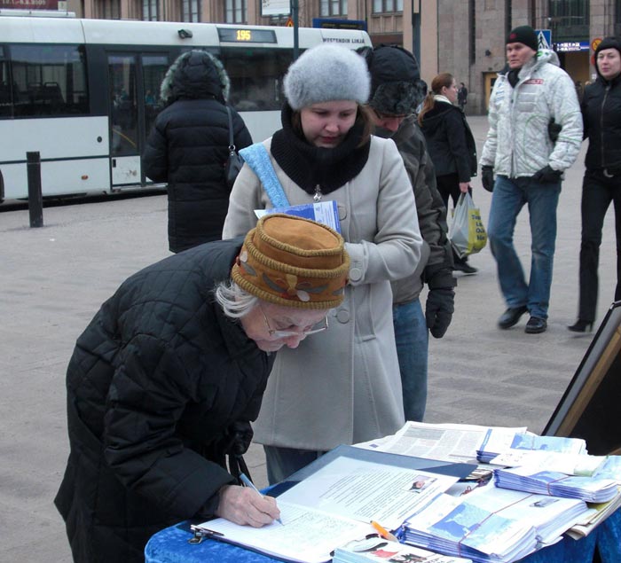 刺骨的寒风中,醒目的蓝底黄字的“法轮大法好”和白底蓝字的“停止迫害法轮功”等横幅,吸引过往民众的视线,不断听到人们说到:“法轮功”、“法轮功”!很多人伸手接真相资料并说:“Kiitos!”(芬兰语:谢谢)更不断有人伸出援手在制止迫害法轮功的征签簿上签名声援。
