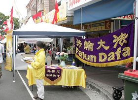 法轮功学员还在热闹的集市上设立了法轮大法的真相摊位、分发大法真相资料,演示五套功法,在展示法轮大法美好的同时,揭露中共十年来对遵循“真、善、忍”的修炼者的迫害。法轮功展位吸引了很多有缘人。很多人索要真相资料,当他们了解到中共残忍的活摘法轮功学员的器官,牟取暴利时,他们谴责中共的非人道行为。