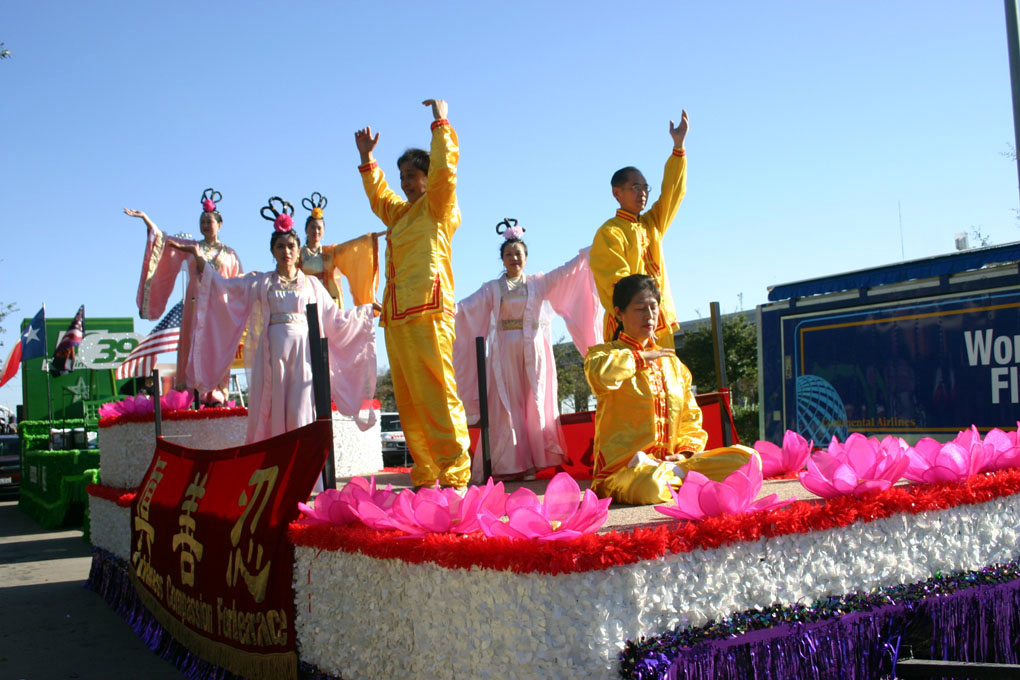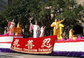 身着亮丽汉服天国乐团是首次在马丁路德金大游行亮相,他们神采奕奕,演奏独特,格外醒目;随后是精美的花车,身着黄色炼功服的法轮功学员在上面演示法轮功功法,舒缓的音乐与炼功动作,吸引了观众的目光,并赢得观众喝彩:“棒极了(Wonderful), 太美了(Beautiful)。”一路上观众中不断传出叫好声,并有观众模仿炼功动作,还有的拿着录影机和照像机抢拍这美好的镜头。