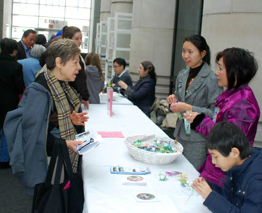 新泽西法轮功学员的展位吸引了很多对修炼感兴趣的人们。