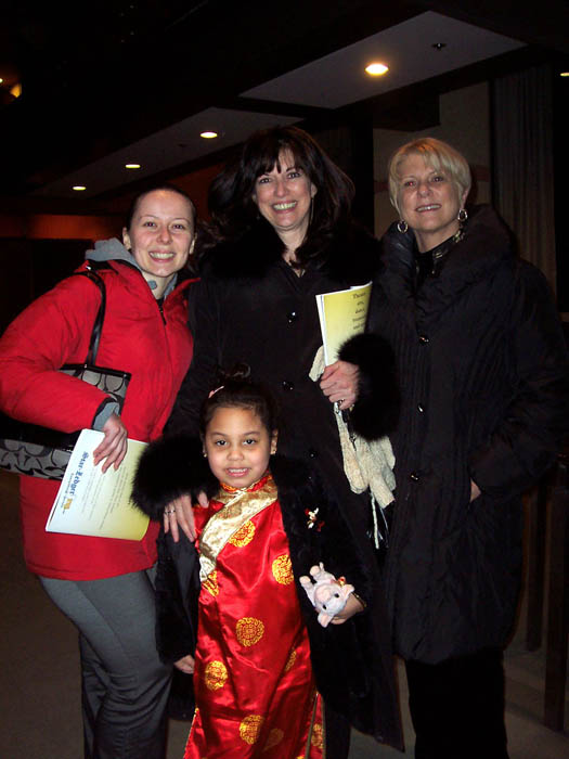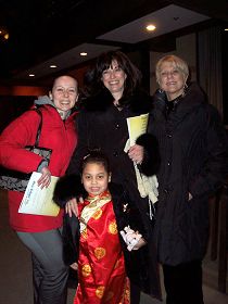 前专业舞蹈演员、新泽西中学校长凯茜(Kathy Young)(中)和同是中学校长卡尔(Kall Brancado)一起带女儿前来观看神韵晚会。Kall的小女儿Ariana说很喜欢晚会,她还学到了中国文化和中文。