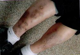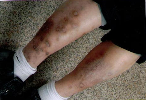 这次铁椅子酷刑,我的两条小腿被迫害的肿象大腿一样粗,那些还没有痊愈的伤疤又开始变坏,两条腿又麻又木,没有知觉,不能行走,好象根本不是自己的腿。据悉,被绑铁椅子如果超过半个月,大腿肌肉就会萎缩、坏死,以前就有过先例。而我这次被绑坐了十七天。幸而在师尊的慈悲呵护下,我得以很快恢复了行动能力。但直到二零零八年四月二十四日我走出劳教所时,小腿上还留下的疤痕、黑斑,有照片为证(上面的照片),这是我被邪*党-恶警肉体折磨留下的证据。照片是二零零八年十一月十八日照的,虽然时隔一年多,依然疤痕累累。