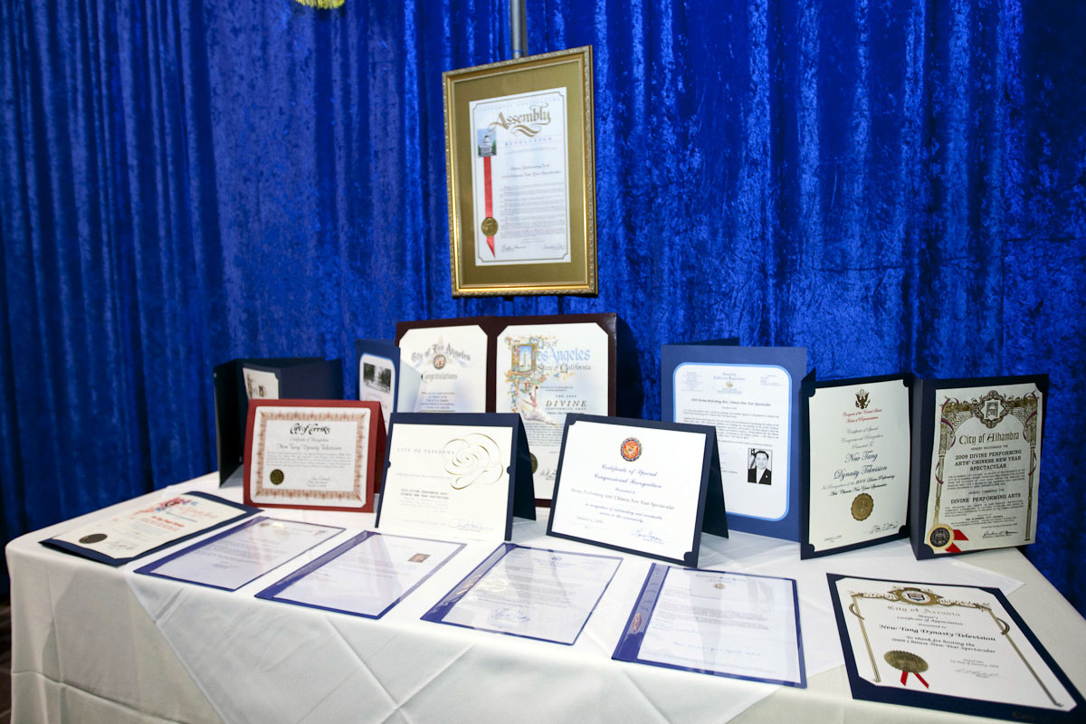 ![]() 洛杉矶神韵晚会开演前,晚会主办单位收到来自国会议员、州议长、州议员、市长和市议会的近二十份褒奖和贺状。 |