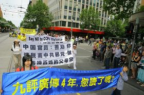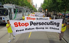 站在他们旁边的王先生也是刚来到澳洲三个月。他说这是第一次看到法轮功的游行。这次法轮功游行的内容这么丰富,参加的人这么多,真是令他很意外。一个华人的团体可以组织这样大规模的游行,真是佩服。他说在国内的时候只是听国内的一面宣传,到了澳洲以后有机会看到大.纪.元;时报,也看了《·九·评*共产党》,让他可以全面的了解整个事情的真相。以后他也会自己继续了解整个事情。他说出国的时候“办公室”(江氏为迫害法轮功成立的非法组织,凌驾于公、检、法之上)还问过他们有没有炼法轮功。也知道在国内如果被知道是炼法轮功的一定是要坐牢的。