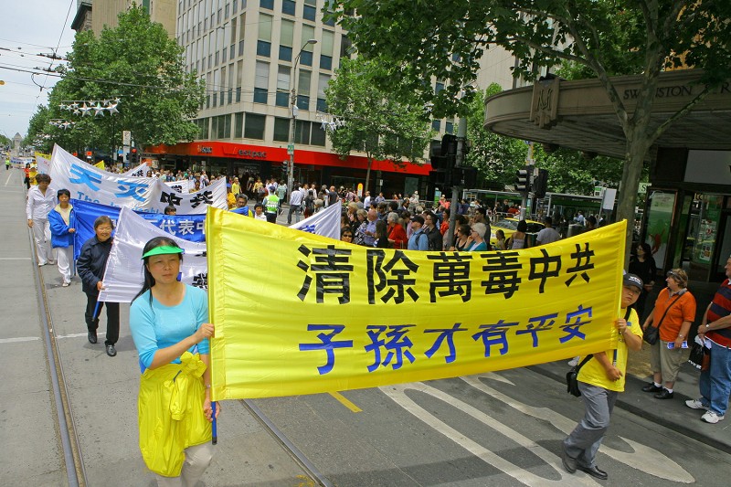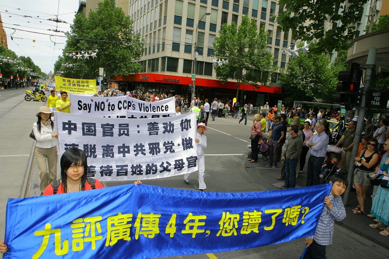 绵延数公里的壮观的游行队伍,由警车开道、骑警领路并断后,在墨尔本市中心游人如织的大道缓行,把法轮大法的美好、被中共残酷九年的真相、由《·九·评*共产党》引发的风起云涌的三:退.大潮(退出中共党、团、队组织),再次展现给墨尔本的民众和四方游客,人们被眼前的一切所震惊,而被深深吸引,纷纷举起相机、摄像机,拍下这历史性的一刻。
