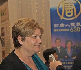 被演出打动落泪的思娜•麦克肯娜(McKenna)女士,是渥太华大学教盖尔语言和歌曲的教授兼艺术家,同时也是作家。令思娜最感动的是《威严与慈悲》中那个受害的女法轮功学员。思娜说:“我可以感受到那些善良的中国人所受到的伤害,希望有一天中国人能够得到信仰自由。”