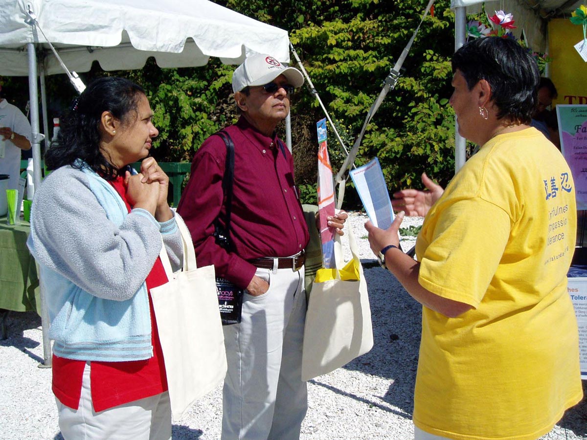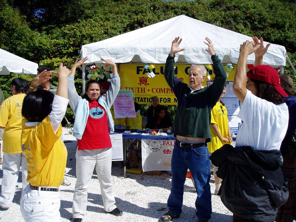 家住林肯市年逾六十的安娜女士和她母亲来到展位前。当听到法轮功是一个非常好的祛病健身功法时,当场就想学。学了第一套功法后,她感觉自己疼痛的背舒服多了。她连忙询问在哪能买到炼功音乐带,并留下自己的地址,说她会按教功录像带学炼法轮功。
