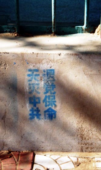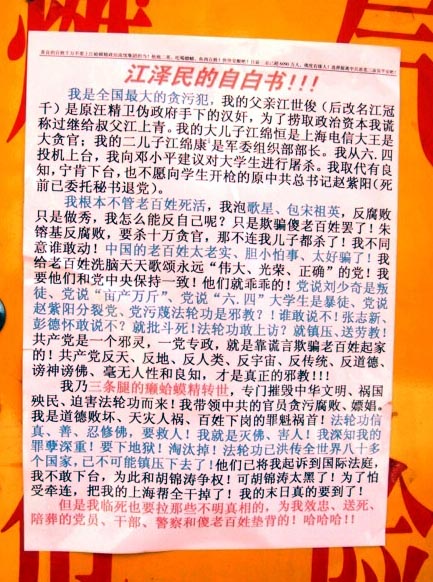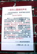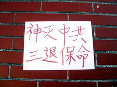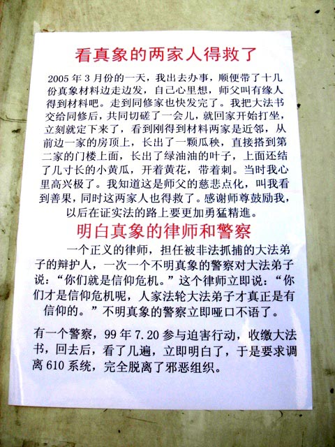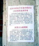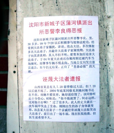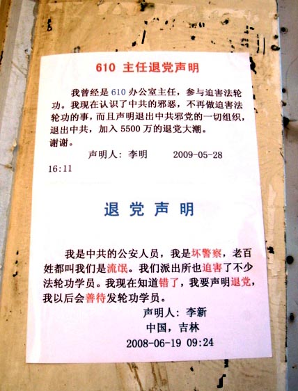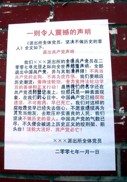 这是在中国大陆北方某大城市的城市、乡村道路两边的电线杆上、围墙上、大树上家属楼的墙上、门上、及体育广场的立柱上等地方出现条幅、喷漆和不干胶标语——条幅上写着:“法轮大法好”、“真善忍好”、“天灭中共”、“退!党!保命”;喷漆喷出的标语有:“法轮大法好”、“真善忍好”、“天灭中共”、“退!党!保命”、“中共窃国六十周年”、“驱除中共恶党,还我中华”、“恶党不亡,国无宁日”、““法轮大法好”、“平反法轮功,法办江泽民”等。