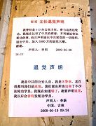 不干胶上写着:“大法洪传114个国家的图片”、“迫害法轮功彻底失败了”、“江泽民的自白书”、“天灭中共三:退.平安”、“中国大陆公安国安迫害法轮功恶报知多少?”、“一则令人震撼的声明”、“老百姓觉醒了”、“派出所的集体退!党!声明”、“迫害大法遭恶报的事例”及退!党!声明等。