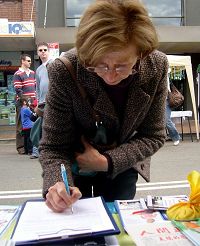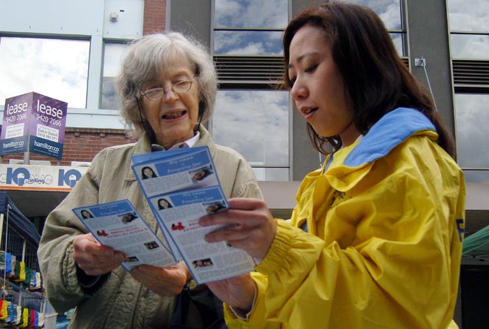 诺拉(Nola Braude)女士在癌症协会摊位上帮忙了一天,在下午四点多钟,当法轮功学员准备收摊离去的时候,她径直走到摊位,在征签表上签名支持法轮功。她说:“我早就听说了关于法轮功被迫害的事,我非常愤怒,我一直在关注你们,希望迫害马上结束。”临走前,她再次表达了对法轮功学员的鼓励和支持。
