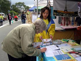 在法轮功的摊位前,来往游客络绎不绝,法轮功学员有的演示法轮功(又称法轮大法)的五套功法,有的向游客发放介绍法轮大法的真相传单;对于民众关心和好奇的询问,学员们都热情的介绍什么是法轮功,及仍在中国发生的中共对法轮功的残酷迫害。当听到因为修炼这样祥和美好的功法而被中共邪*党-迫害长达十年之后,他们感到不可思议,了解真相的人们纷纷签名谴责中共暴行,支持制止迫害。