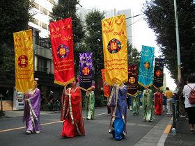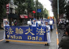 ![]() 法轮功队伍由身着古装、威风凛凛的天国乐团作前导,鼓号齐鸣,把法轮大法好的声音传遍周边。 |