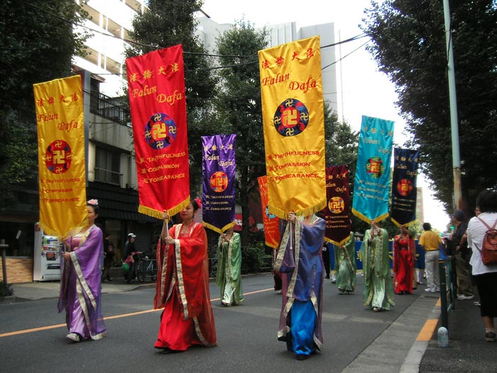 法轮功队伍在杉山公园准备出发时,就吸引了来往行人的注目。来日本三年的四川女士表示,今天看到法轮大法队伍非常开心,法轮功修炼“真、善、忍”,她要到炼功点学功。