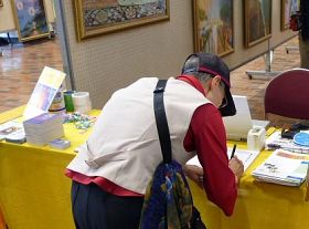 一位日本老人站在以炼功为主题的画作「天人合一」的前面作合掌状,讲解员上前询问,老人讲述了自己的经历:自己因身体的原因从三十二年前开始练习类似气功的打坐练习,身体健康得到改善;所以他对拥有五千年历史的中国气功有着浓厚的兴趣。今天路过画展,他感受到一股非常祥和又有力的能量,就走了进来。讲解员向老人介绍在现在的中国,包括气功在内的许多国粹,已被共产党通过各种运动破坏殆尽,要想体验中国的传统文化,还要到外国去的现状后,老人大呼可惜。画作所传达的正的力量使老人对法轮功有了不一样的感受,临走时,老人带走了真相及功法的资料,表示要详细了解和学功。