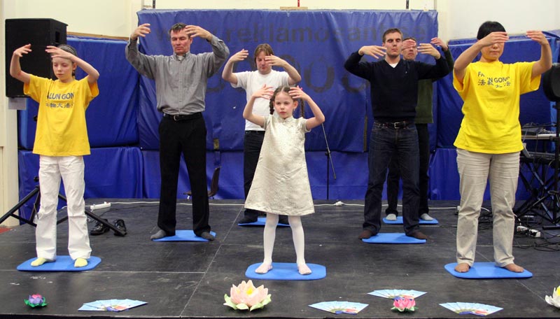 ![]() 法轮功学员在展览大厅的舞台上做功法表演 |