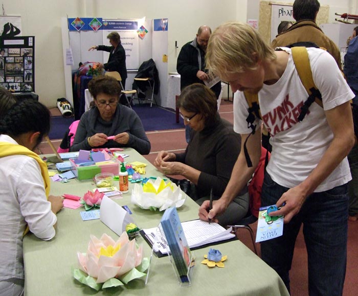 ![]() 人们边学折纸莲花边听真相,明白真相后签名支持反迫害。 |