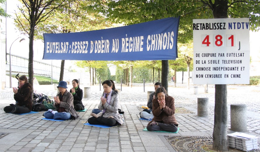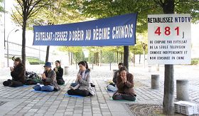 ![]() 图:新!唐!人:电视台支持者在欧卫巴黎总部旁打出展板,抗议欧卫切断唯一独立(对华播出)的中文电视台。 横幅内容:欧卫:停止听命于中共当局。 |