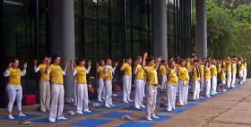 ![]() 参加巴西法会的学员们在会场外集体炼功 |