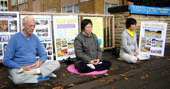 在曼城中领馆,法轮功学员常年坚持在此讲真相、反迫害。学员们表示,在国殇日这一天来到这里特别重要。我们在此就是对谎言的揭露和抗议,也是对在中国大陆受迫害的法轮功学员和其他百姓的支持。