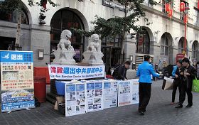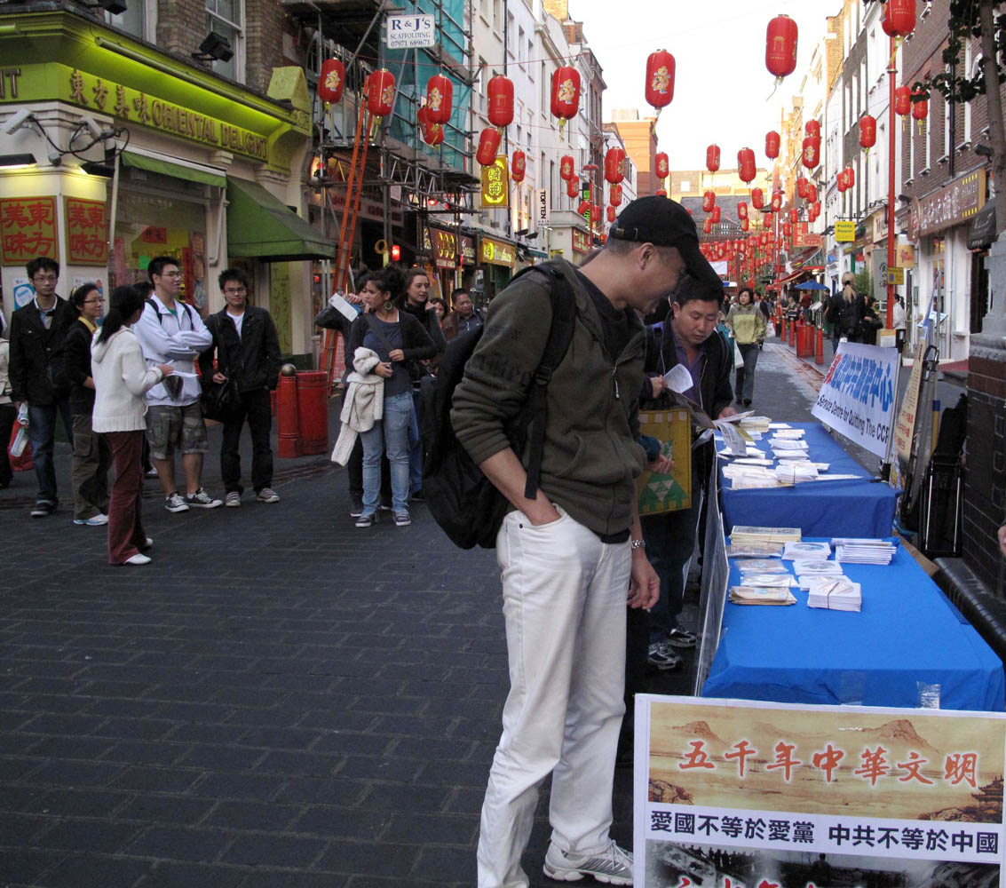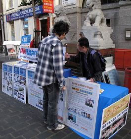 伦敦唐人街上,也有很多中国大陆人并不拒绝真相。一些大陆青年在经过信息台时,目光总是被法轮功遭迫害真相展板所吸引;随同旅游团的大陆游客集体走过信息台时,他们的目光往往被退!党!大潮信息和“亡共石”图片所吸引;一些大陆留学生不接传单资料,却经常三五成群站在一旁认真阅读退!党!大潮信息和“亡共石”图片。
