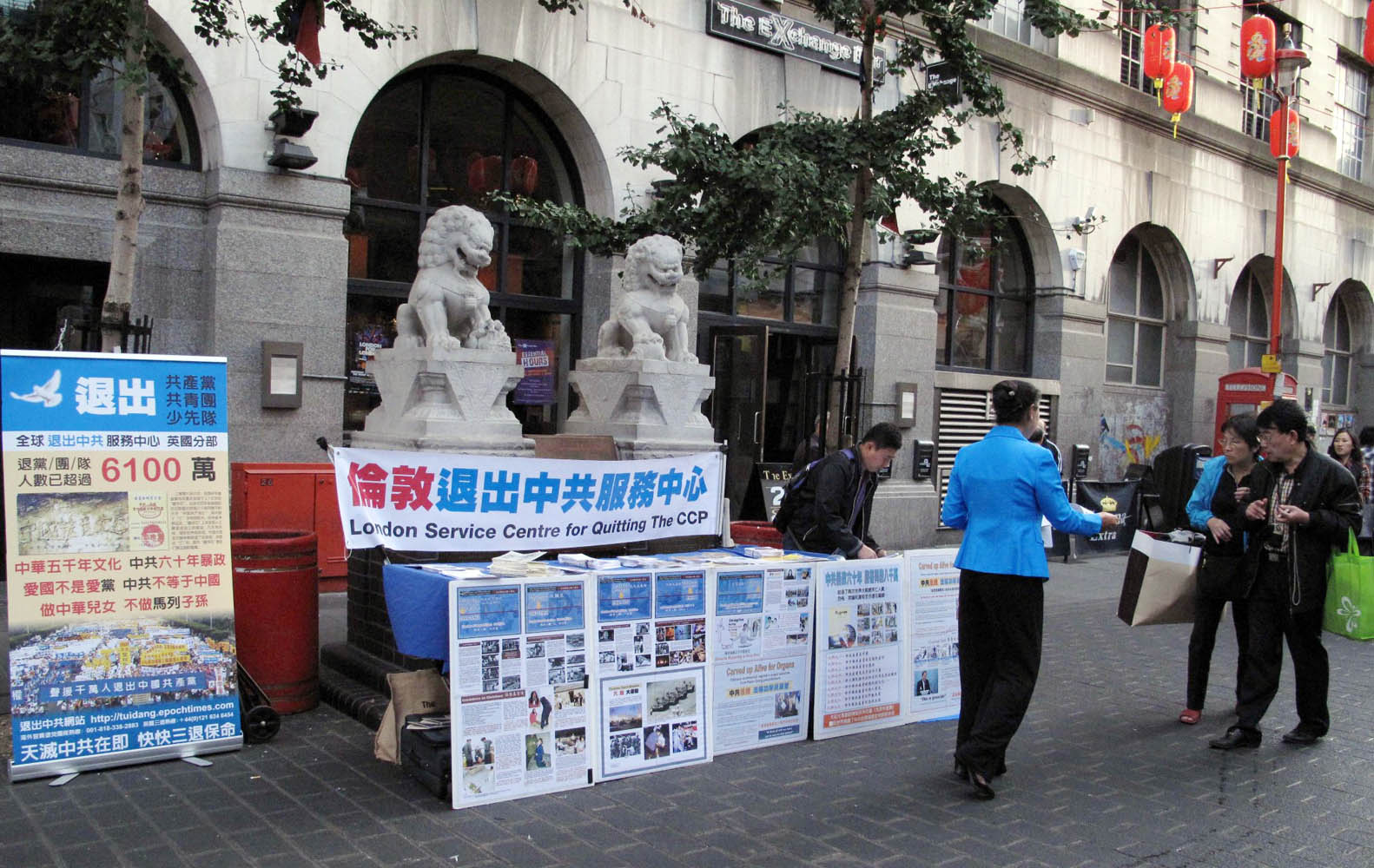 今年十•一来伦敦唐人街的人们不会错过摆置在石狮子前的伦敦退!党!服务中心信息台。信息台前精心摆放了中英文的揭露中共邪*党-六十年罪行的真相展板,其中法轮功学员被酷刑折磨的照片赫然在目。桌面上摆放了多种真相资料,其中包括“法轮功”“·九·评*共产党”和“三:退.”等方面的文字资料和光盘。信息台蓝色的桌布、蓝白色调为主的印字横幅和展板,在伦敦唐人街挂满红色灯笼的街道上显得格外庄重和脱俗。