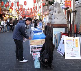 一位上了年纪的西人男士认真阅读了展板上中共邪*党-迫害法轮功的真相信息后,对着旁边的一位女学员激动地说:“真没想到中共还这么坏,我还以为开了奥运了它就会改善了,真没想到它还这么坏。”“我支持你们。”