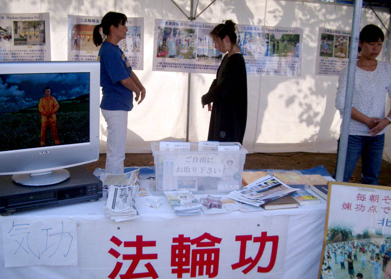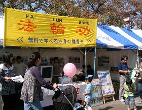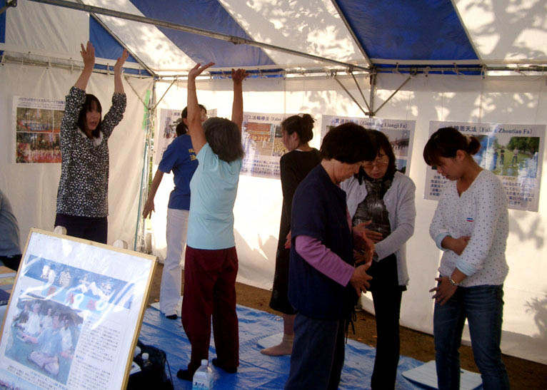 活动期间,法轮功学员在展位上摆放大法洪传世界的看板和图片,播放李洪志老师的教功录像,向人们发送有关法轮功的介绍资料;有的市民们在展位上学习了法轮功的五套功法。