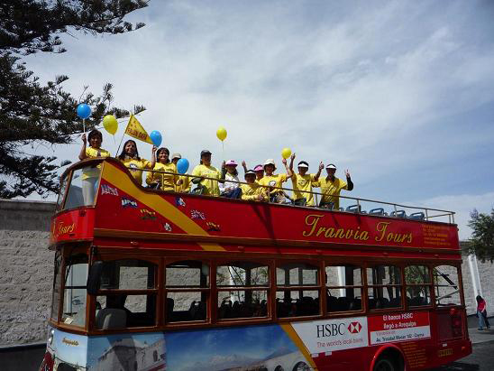 ![]() 学员利用旅游巴士作为交通工具,向阿雷基帕市的各个角落的民众和来自世界各地的观光者介绍法轮大法。 |