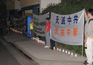 杨军接着说:我们今天在这里就是要悼念中共暴政六十年中失去生命的中华儿女。我们在中领馆前点上蜡烛表示对他们的哀思,让他们的冤魂得以慰藉。天灭中共在即,让它们早点放下自己手中的屠刀,向被它们杀害的八千万冤魂去谢罪。