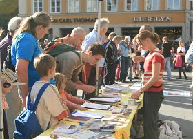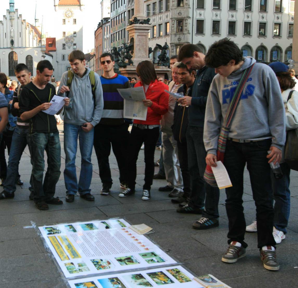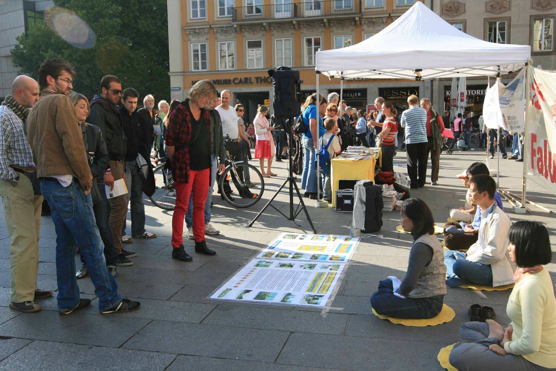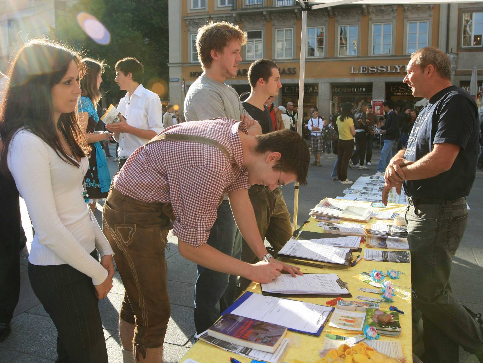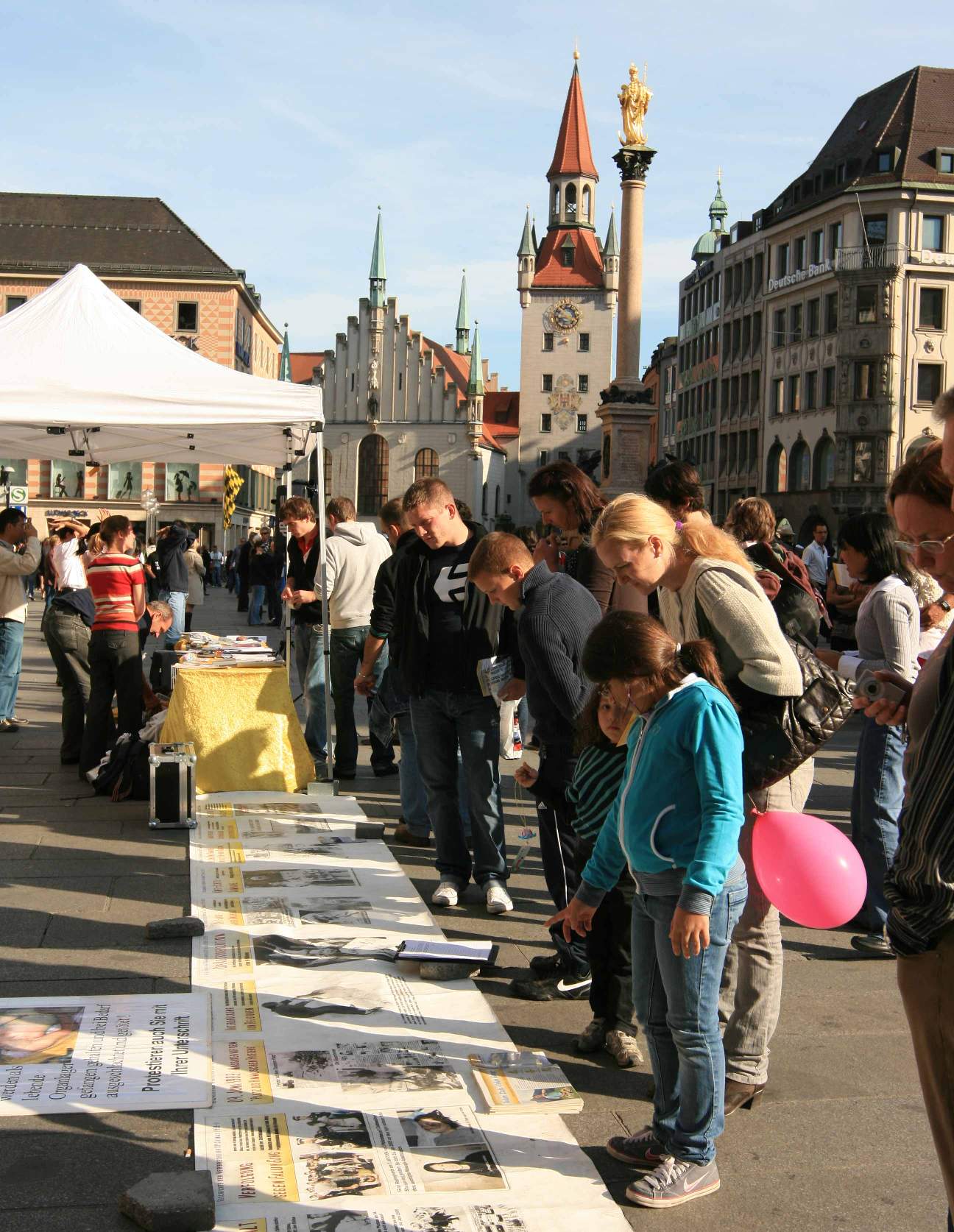 十月三日,为响应全球.退:党!服务中心“悼国殇 促三:退.”的活动,慕尼黑退!党!服务中心和法轮功学员举办了声援六千一百万中国人退出中共的活动,吸引了大量德国民众和世界各地游客的目光。人们为中共六十年来的暴政所震惊,特别是当了解到中共活体摘取法轮功学员器官的真相后,民众纷纷谴责中共的暴虐行径,不少人签名呼吁制止迫害。不少德国民众都提到和中国的贸易合作过程中,决不能忽视人权问题,有的表示希望新的政府能重视中国的人权问题。很多来慕尼黑旅游的中国人和代表团也在观看展板,接过资料,有的还拍照留影。
