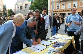 在专利局工作的格茨女士(Gotz)和她的朋友科特女士(Kothe)看到图片后主动签名,她们都觉得德国政府在中国人权问题上态度不够坚决,过多地看重经济利益,对中共践踏人权的行径采取绥靖政策。她们认为如果没有对人权的重视,经济上也搞不上去。她们希望刚刚获得大选胜利的新政府能够做好这一点。