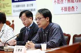 ![]() 人权律师邱晃泉(左)及民间司法改革基金会执行长林峰正律师(右)呼吁台北地检署应侦办,还给人民真相。 |
