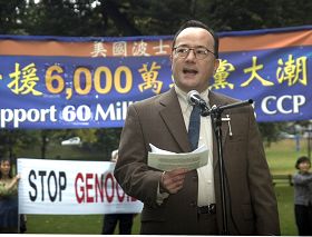 “中国民主后援国际”组织(China Support Network)的创始人库萨密先生(John Kusumi)发言表示,二零零五年时他曾参加退!党!集会,庆祝一百万人退出中共,而今这个数字已经到了六千万了,这是真正的发自中国人心底的声音。库萨密先生说,这六千万人把他们的勇气汇聚在一起,他们是真正值得敬佩的。