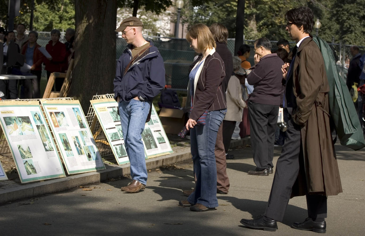 ![]() 民众观看揭露中共迫害法轮功的真相展板 |