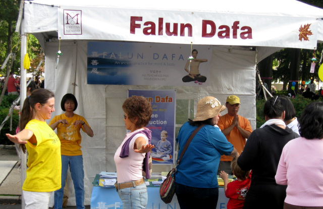 一位女士说:“我在这里买东西,见朋友,很紧张,一路匆忙。但走到这儿,听到法轮功的音乐,我感到很轻松”。
