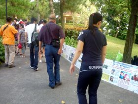 【明慧网二零零九年十月七日】二零零九年十月一日,中国国殇日当日,在风景优美的新加坡花柏山(Mount Faber)景点,来了不少中国各地的同胞和旅行团,他们在此观光,趁此机会了解法轮功真相;并有二百多人现场三