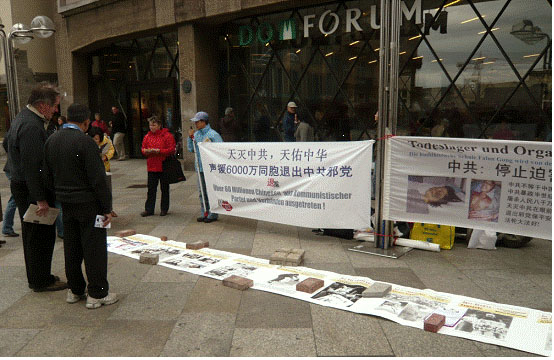 本次活动是德国退!党!服务中心组织的退!党!活动的一部份,同样的活动还在柏林,慕尼黑和汉堡举办。在科隆大教堂前,一个八米长的横幅上配有图片,详细揭露了中共六十年来迫害中国人的历史。两个分别六米长的横幅向世人传递六千万中国人退出中共的信息,以及中共活摘法轮功学员器官的行为。看过图片后,很多人在反对活摘器官的征签表上签名。