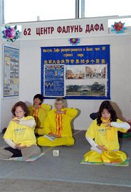 在二楼法轮大法的展位上,学员们展示了法轮功的功法,教小朋友们叠纸莲花,回答对大法感兴趣的人的各种问题。每天下午四点,随着大法的音乐和师父洪亮的声音响起,大厅一下子安静下来,大法学员在会场中心舞台表演功法,女学员维纳尼卡还演唱了“得度”等大法歌曲。