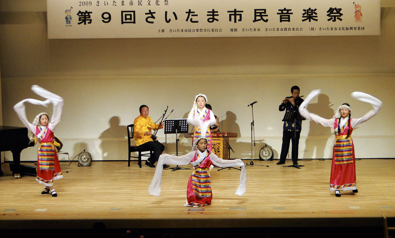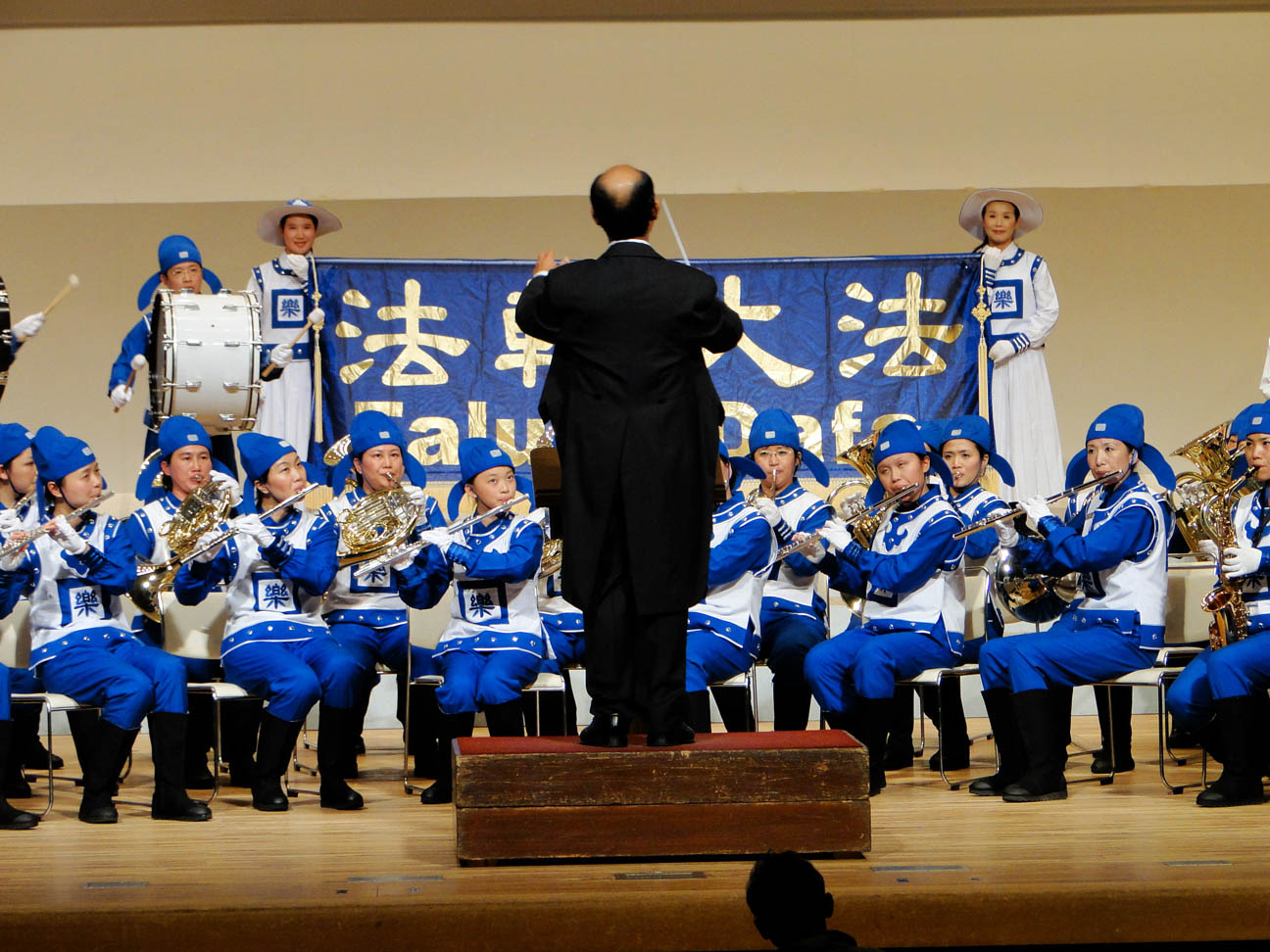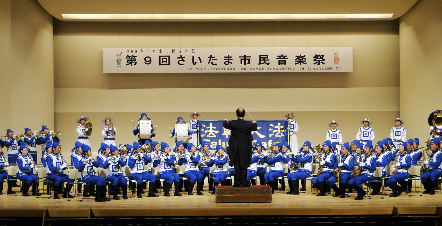 一色中国古装的台湾天国乐团和日本天国乐团的学员们,二零零九年十一月八日在日本首都圈的琦玉市民音乐节登场,为现场的观众演奏了《法轮大法好》、《送宝》等六首曲目,庄严辉煌的乐曲,震撼现场观众。