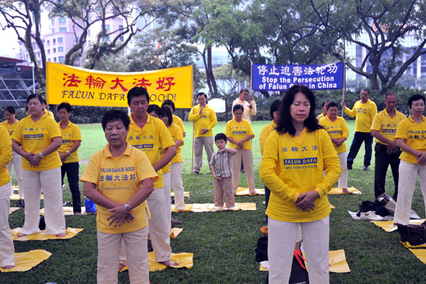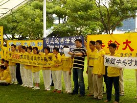 新加坡法轮佛学会主席黄威强博士在发言中表示:“法轮功学员们相信:善有善报,恶有恶报。十年了,迫害还在继续。法轮功学员还在被非法抓捕和关押,被酷刑折磨、虐杀。解体中共,才能停止迫害。这是一项人权诉求,而不是政治诉求。我们呼吁:善良的人们站在正义一边,共同制止中共的迫害。”