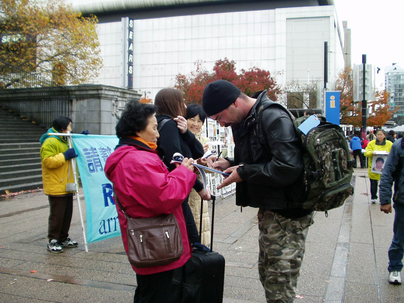 短短4个小时的征签活动,一共征得八百多人签名。温哥华学员表示,哈珀访华前,征签活动还会继续进行。